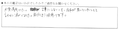 大変満足でした。言葉にしなくても、自分が思っていたことを言われて涙が出ました。前向きに頑張ります。