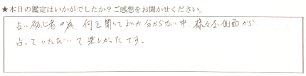 占い初心者のため、何を聞いて良いかわからない中、様々な側面から占っていただいて楽しかったです。