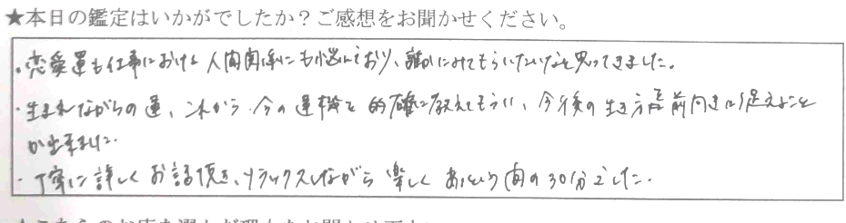 恋愛運も仕事における人間関係にも悩んでおり、誰かにみてもらいたいなと思っていました。生まれながら運、これから今の運機を適確に教えてもらい、今後の生き方を前向きに捉えることが出来ました。丁寧に詳しくお話し頂き、リラックスしながら楽しくあっという間の30分でした。