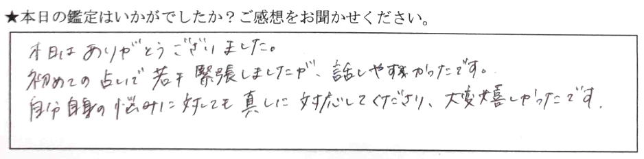 今日はありがとうございました。初めての占いで若干緊張しましたが、話しやすかったです。自分自身の悩みに対しても真摯に対応してくださり、大変嬉しかったです。