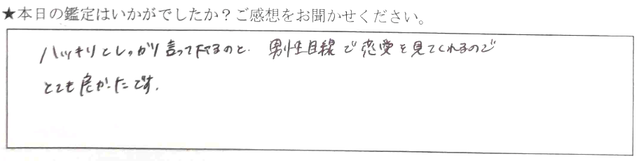 ハッキリとしっかり言って下さるのと、男性目線で恋愛を見てくれるのでとても良かったです。