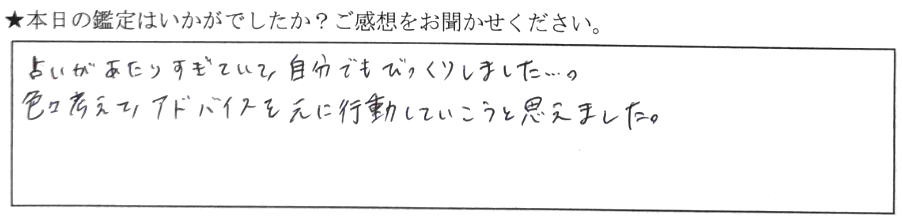 占いが当たりすぎていて、自分でもびっくりしました。色々考えて、アドバイスを元に行動していこうと思えました。
