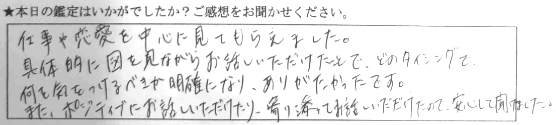 仕事や恋愛を中心に見てもらいました。具体的に図を見ながらお話ししていただけたことで、どのタイミングで何を気をつけるべきか明確になり、ありがたかったです。またポジティブにお話ししていただけたり、寄り添ってお話ししていただけたので、安心して聞けました。