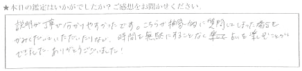 自分が長年疑問に思っていた事を先生が短く言葉で、解決して下さいました。言われた時、頭に稲妻が落ちた感覚でした。また伺いたいです。