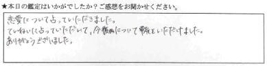 恋愛について占っていただきました。ていねいに占っていただいて、今後について勇気をいただけました。ありがとうございました。