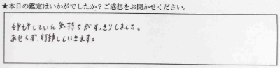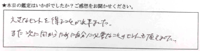 思ったより、今の運勢、これからの運勢がよかったので、希望がわきました。内容濃くみていただいて、ありがとうございます。また少し落ち着いてきたタイミングか、何かあった時などに、よろしくお願いいたします。