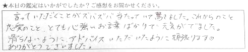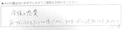 言っていただくことがズバズバ当たっていて驚きました。これからのこと、恋愛のこと、とても心強いお言葉ばかりで元気が出ました。滑らないようにアドバイスいただいたように頑張ります♡ありがとうございました。