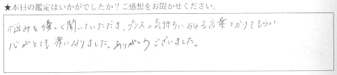 悩みを優しく聞いていただき、プラスの気持ちになれる言葉をかけてもらい、心がとても楽になりました。ありがとうございました。