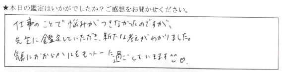 仕事のことで悩みがつきなかったのですが、先生に鑑定していただき、新たな考えがわかりました。気長におおらかにをモットーに過ごしていきます☺️