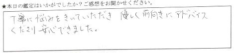 丁寧に悩みをきいていただき優しく前向きにアドバイスくださり安心できました。