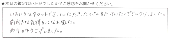 いろいろなタロットで占っていただき、たくさん当たっていたのでビックリしました。前向きな気持ちになれました。ありがとうございました。