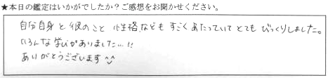 私自身を、私よりわかっていていっぱいお話聞けて楽しかったです!未来の自分を知れて良かった!これからも自分の好きなお仕事を頑張ります!ありがとうございました😄