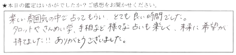 楽しい雰囲気の中で占ってもらい、とても良い時間でした。タロットや算命学、手相など様々な占いも楽しく、未来に希望が持てもした‼︎ありがとうございました。