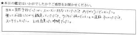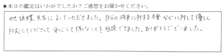 当日の突然予約でしたが、スムーズに対応していただきありがとうございました。楽しくお話しながら鑑定していただき、ウジウジ悩んでいることの道筋示していただき、スッキリしました。とても充実した時間でした。