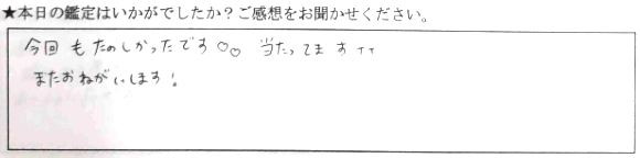 未来が明るくなる鑑定に悩みが吹っ切れました。ゆき胡蝶先生にまた鑑定をお願いしたいです‼︎ありがとうございます。