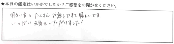 悩んでいたことが、スッキリしました!彼がどう思っているか、少し分かった気がして、心が軽くなりました!来てよかったです!ありがとうございました!