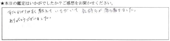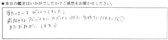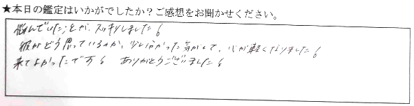 悩んでいたことが、スッキリしました!彼がどう思っているか、少し分かった気がして、心が軽くなりました!来てよかったです!ありがとうございました!