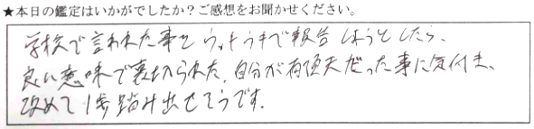 学校で言われた事をウッキウキで報告しようとしたら、良い意味で裏切られた、自分が有頂天だったことに気付き改めて一歩踏み出せそうです。