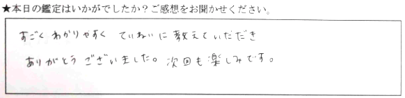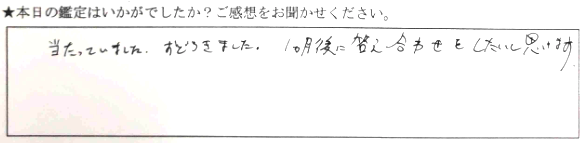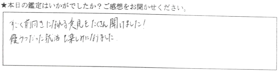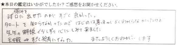 悩みをまず口に出せたのがすごくよかった。タロットを知らなかったので、はじめは意味がよくわからなかったけど、先生の解説で少しずつ心にしみて来ました。天中殺→すごく参考になった。またよろしくお願いします。
