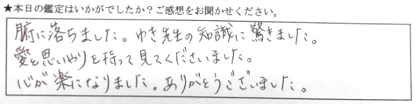 腑に落ちました。ゆき先生の知識に驚きました。愛と思いやりを持って見てくださいました。心が楽になりました。ありがとうございました。
