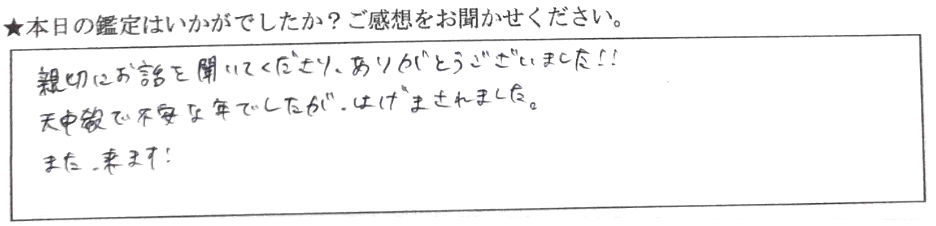 親切にお話を聞いてくださり、ありがとうございました!!天中殺で不安な年でしたが、励まされました。また、来ます!