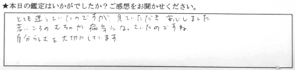 とても迷っていたのですが、見ていただき安心しました。若いころのむちゃが病気になっていたのですね。自分らしさを大切にしています。