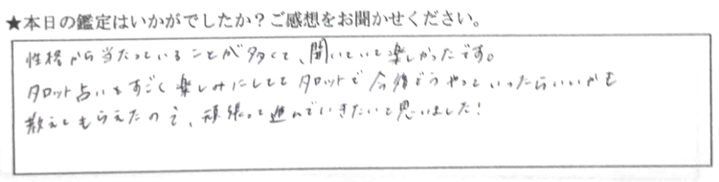 性格から当たっていることが多くて、聞いていても楽しかったです。タロット占いをすごく楽しみにしてて、タロットで今後どうやって行ったらいいかも教えてもらえたので頑張って進んでいきたいと思いました!