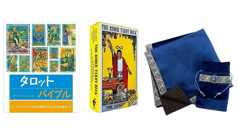 はじめての方は、教材3点セット【タロットバイブル教本、タロットカード、滑り止め付きのタロットクロス(ポーチ付き)】の60分特別レッスン(23,000円)からの受講となります。